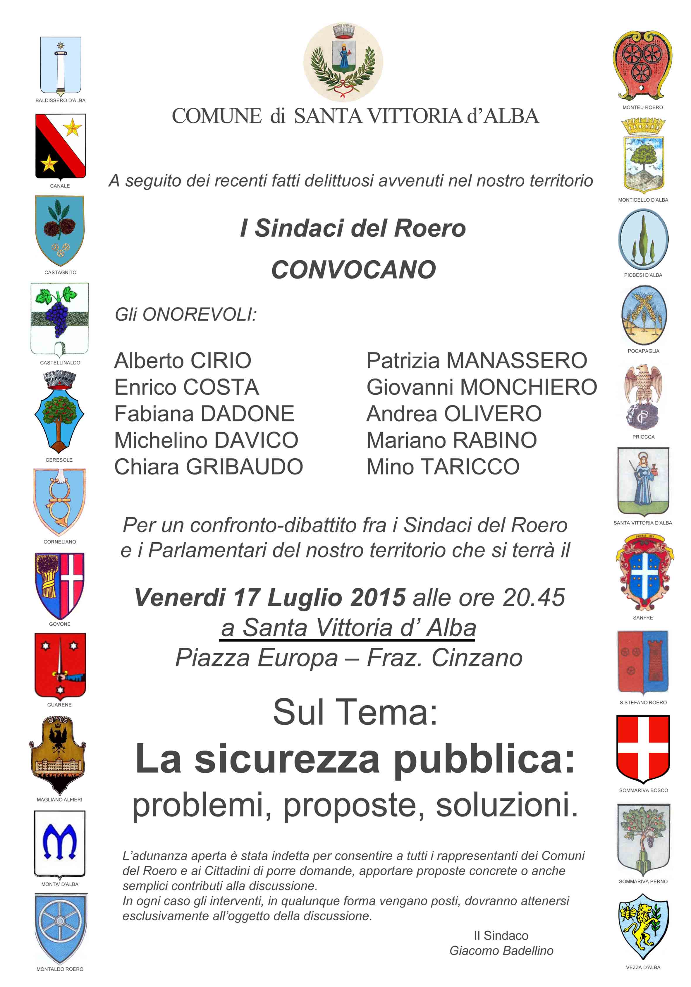I Sindaci del Roero convocano gli Onorevoli: CIRIO, COSTA, DADONE, DAVICO., GRIBAUDO,.... a Santa Vittoria d'Alba per un dibattito sul tema: LA SICUREZZA PUBBLICA.