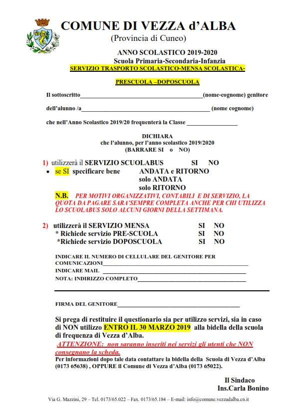 Al fine di poter organizzare in tempo utile i servizi scolastici accessori, il comune invita tutti gli iscritti a compilare la scheda che viene inviata alle famiglie degli iscritti per l'anno scolastico 2019/2020 tramite le insegnanti delle varie classi. Le schede verranno inviate altresi alle classi 5 delle scuole dei comuni viciniori di affluenza: Guarene..Castagnito ..Piobesi e Monteu Roero.