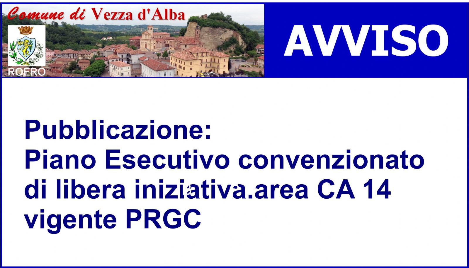 Avviso di pubblicazione: Piano Esecutivo convenzionato di libera iniziativa. area CA 14 vigente PRGC