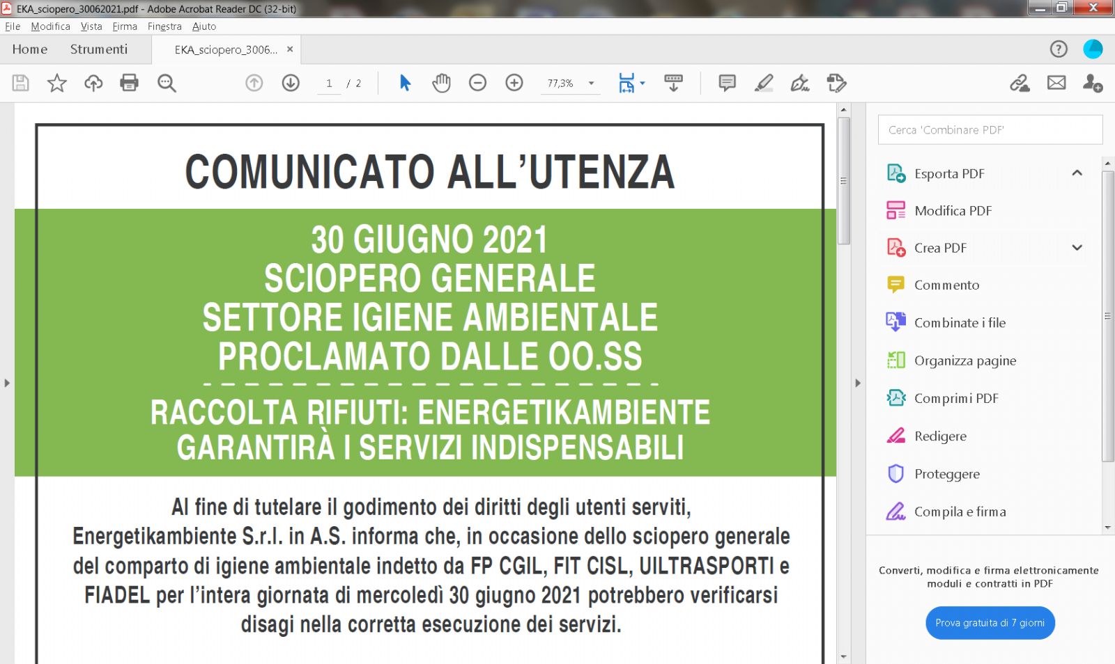 IL PERSONALE DELLA DITTA INCARICATA DEL SERVIZIO RACCOLTA RIFIUTI POTREBBE ADERIRE ALL' SCIOPERO NDETTO PER IL GIORNO 30.6.2021. POTREBBERO PERTANTO VERIFICARSI DISAGI NELLA CORRETTA ESECUZIONE DEI SERVIZI.