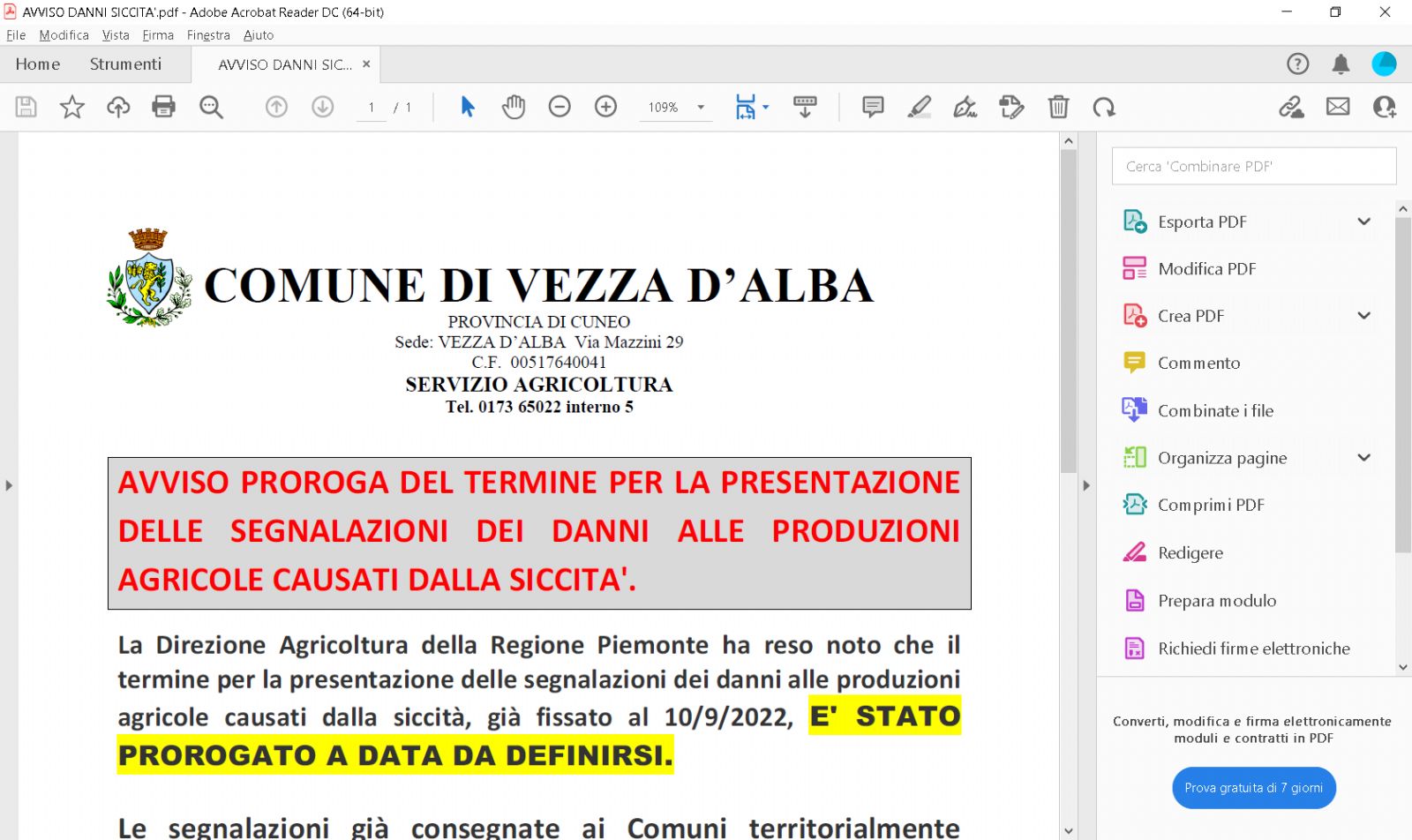 La Direzione Agricoltura della Regione Piemonte ha reso noto che il termine per la presentazione delle segnalazioni dei danni alle produzioni agricole causati dalla siccità, già fissato al 10/9/2022, E' STATO PROROGATO A DATA DA DEFINIRSI.