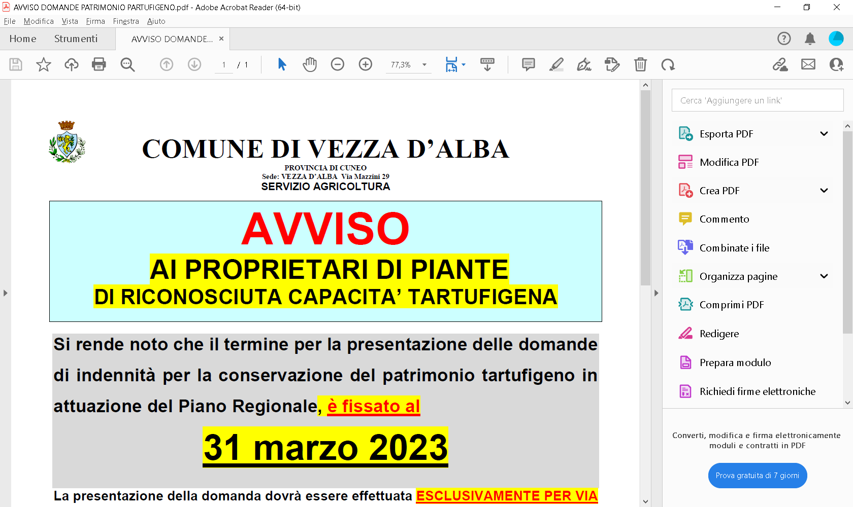 Si rende noto che il termine per la presentazione delle domande di indennità per la conservazione del patrimonio tartufigeno regionale é fissato al 31 marzo 2023.
