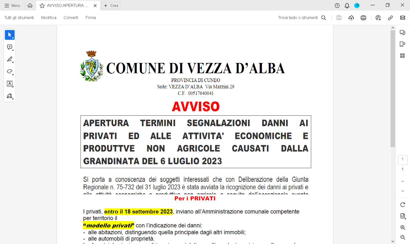 si porta a conoscenza dei soggetti interessati che con deliberazione della giunta regionale n. 75-732 del 31 luglio 2023 é stata avviata la ricognizione dei danni ai privati e alle attività economiche e