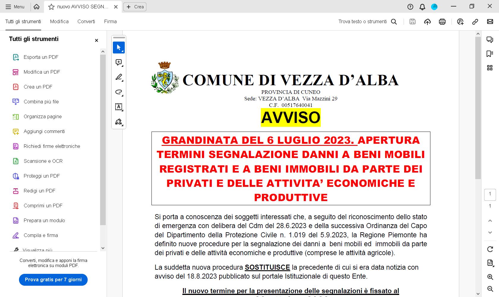 Si porta a conoscenza dei soggetti interessati che, a seguito del riconoscimento dello stato di emergenza con delibera del Cdm del 28.6.2023 e della successiva Ordinanza del Capo del Dipartimento della Protezione Civile n. 1.019 del 5.9.2023, la Regione Piemonte ha definito nuove procedure per la segnalazione dei danni a beni mobili ed immobili da parte dei privati e delle attività economiche e produttive (comprese le attività agricole).