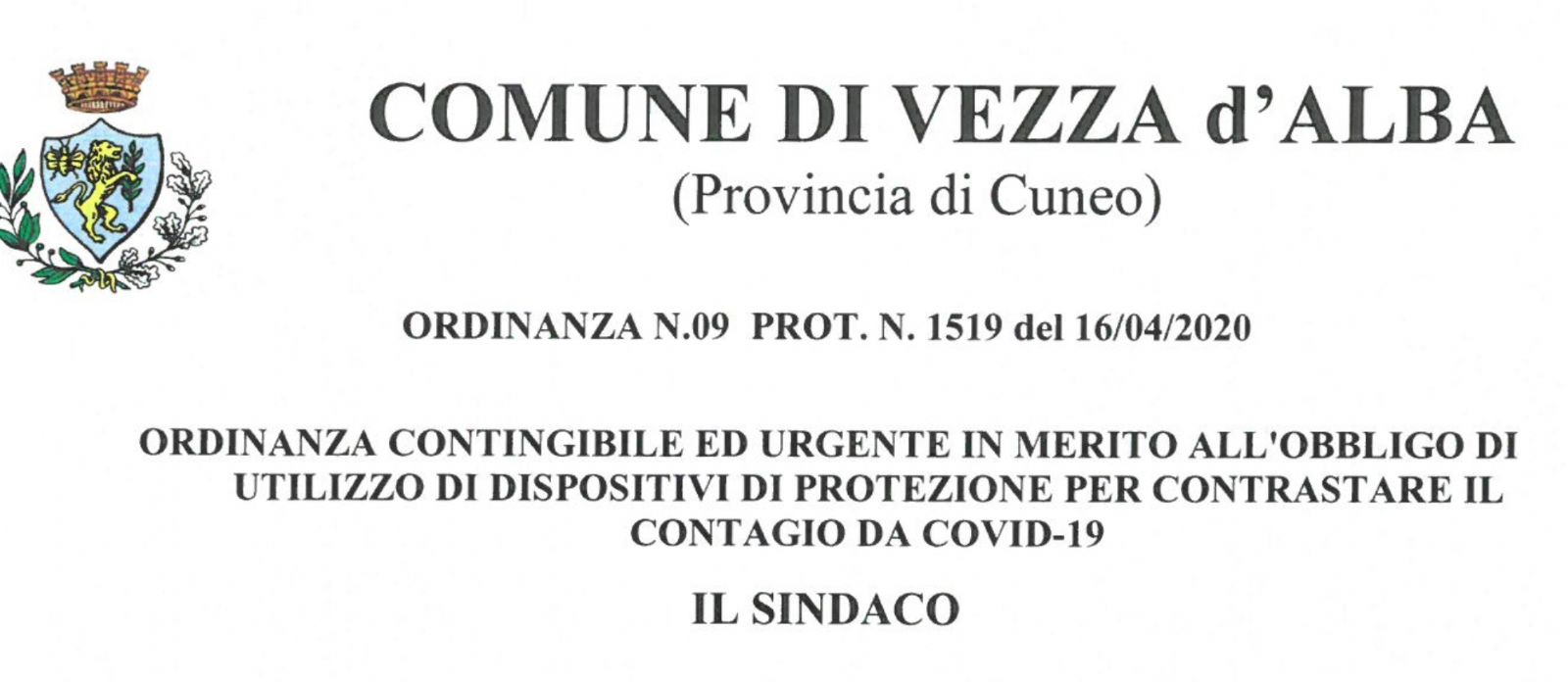 ORDINANZA CONTINGIBILE ED URGENTE IN MERITO ALL'OBBLIGO DI UTILIZZO DJ DISPOSITIVI DI PROTEZIONE PER CONTRAST ARE IL