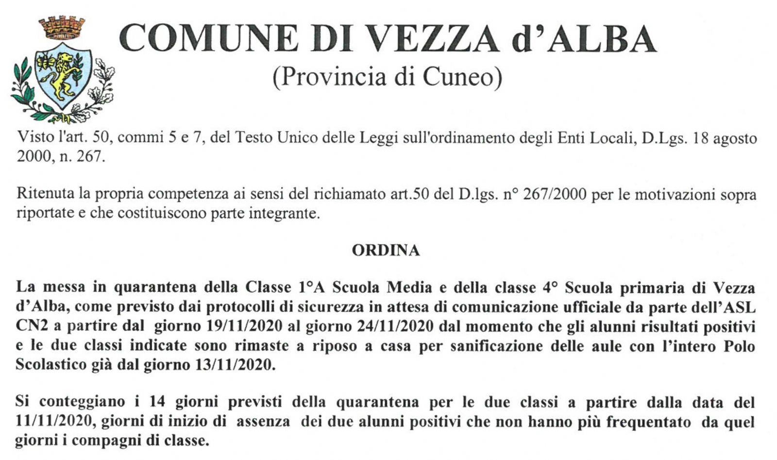 AZIONI per contenimento de/ contagio Covid-19. Chiusura Classe 1°A Scuola Media e de/la classe 4° Scuola primaria di Vezza d'Alba per messa in quarantena.