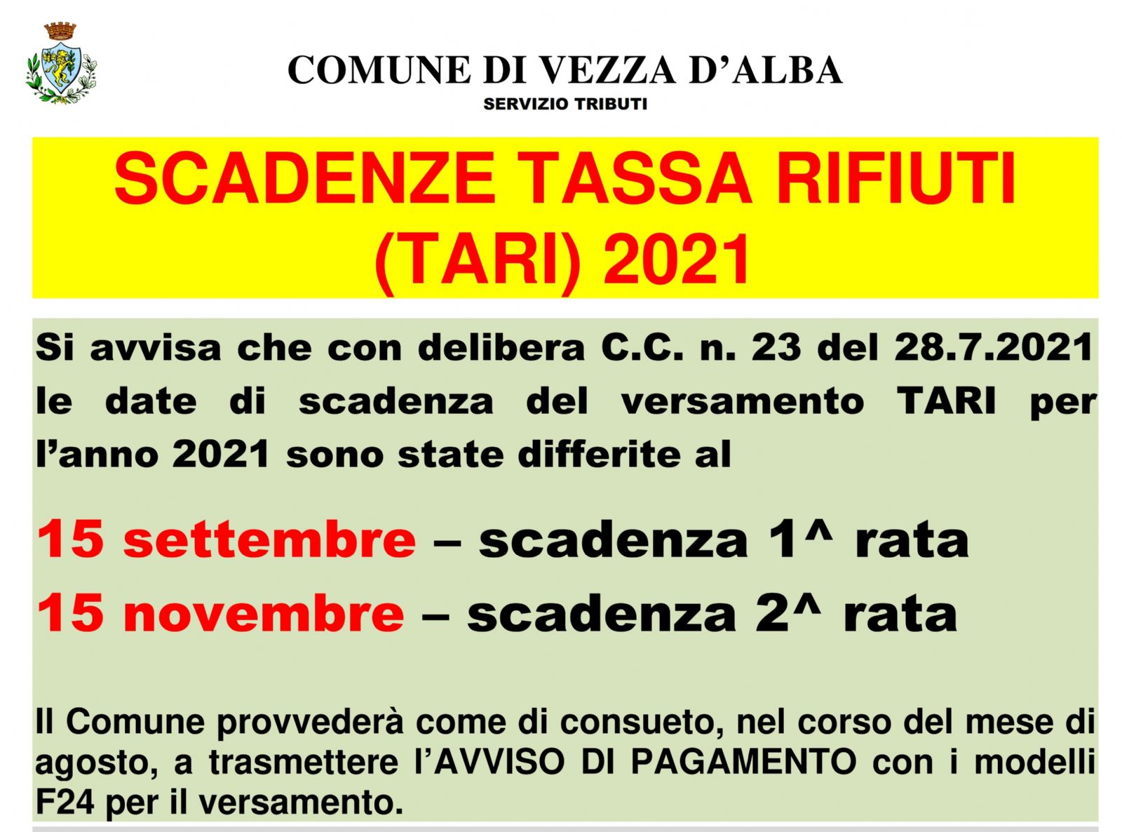 SI AVVISA CHE PER L'ANNO 2021 LE SCADENZE DEL VERSAMENTO TARI SONO STATE DIFFERITE AL